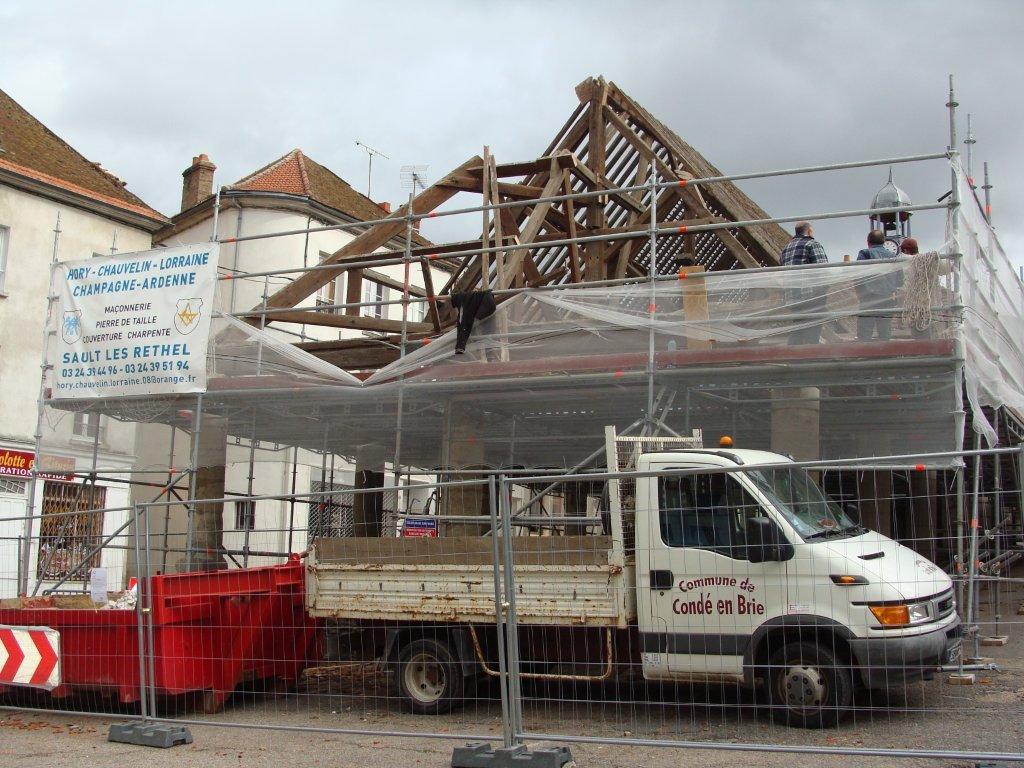 Ce n'est pas du luxe. La commune a décidé de réhabiliter sa halle. Construit aux XVème et XVIème siècles à la demande de Marie de Luxembourg, grand-mère du Prince de Condé et du Duc de Guise, ce marché, classé Monument Historique en 1979, avait vraiment besoin d'un sacré coup de jeune. «C'est un gros travail qui peut durer six mois» a indiqué Jacques Larangot, le maire du chef-lieu de canton. Le montant de la restauration s'élève à 290 000 € HT. Les travaux sont subventionnés à 50% par la DRAC (Direction Régionale des Affaires Culturelles) et le département. Une circulation alternée avec feux tricolores et une signalisation adaptée sont en place pour la sécurité de tous.